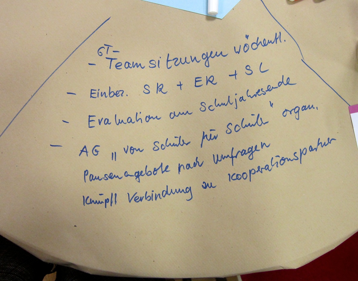 - Beeindruckt hat einzelne Teilnehmende ein Beispiel aus Marburg, bei dem der Schulträger den Schulen einen Service anbietet, um sie zu entlasten. Dies wurde als äußerst förderlich für die Qualitätsentwicklung angesehen.