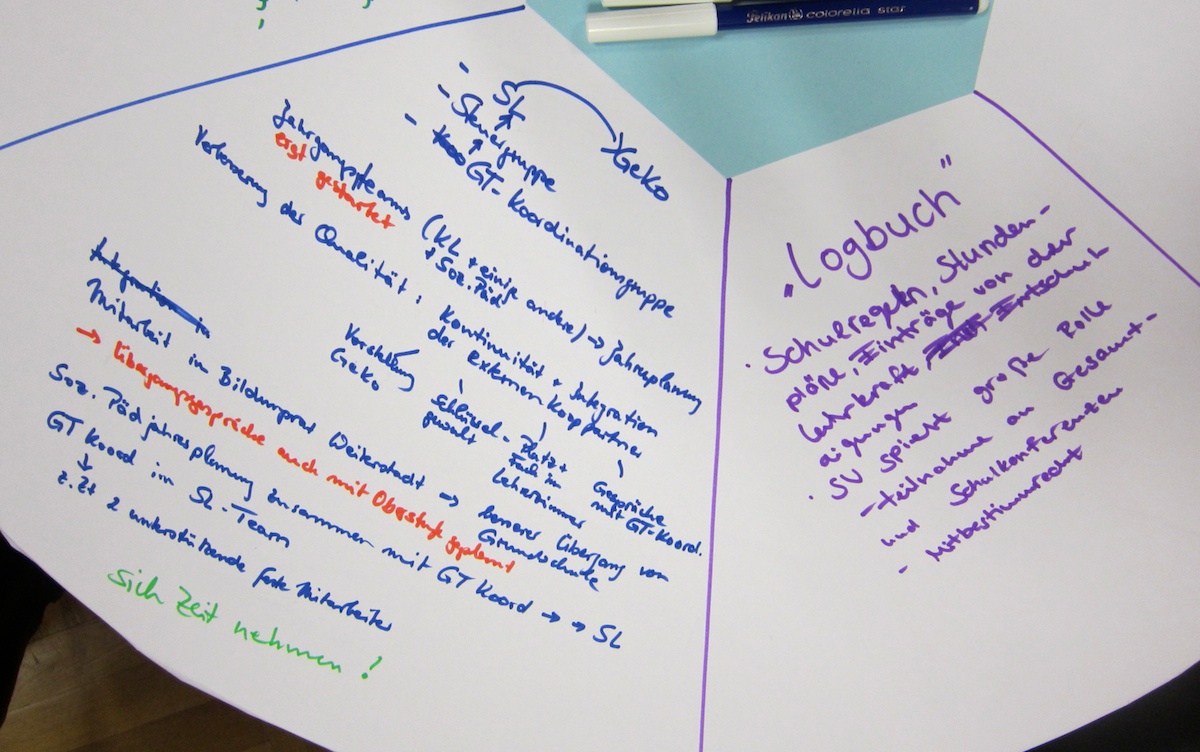- Frau Glaser: „Strukturen sind erstmal da, wichtig als Regeln für die Schüler und für die außerschulischen Partner wegen der Verbindlichkeit. Dann kann man die Strukturen verändern.“