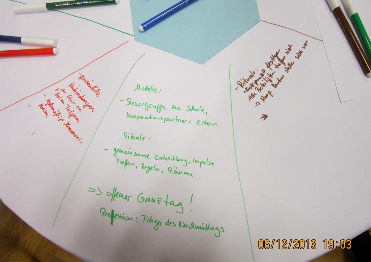 - Teilnehmer: „Ich finde, dass das System Ganztagsschule noch zu sehr aus der Sicht der Schule gedacht wird. Man muss vielleicht anfangen, anders zu denken, damit Kooperationspartner ihr Potential einbringen können.“